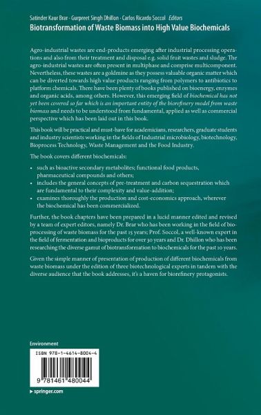 Agro-industrial wastes are end-products emerging after industrial processing operations and also from their treatment and disposal e.g. solid fruit wastes and sludge. The agro-industrial wastes are often present in multiphase and comprise multicomponent. Nevertheless, these wastes are a goldmine as they possess valuable organic matter which can be diverted towards high value products ranging from polymers to antibiotics to platform chemicals. There have been plenty of books published on bioenergy, enzymes and organic acids, among others. However, this emerging field of biochemical has not yet been covered so far which is an important entity of the biorefinery model from waste biomass and needs to be understood from fundamental, applied as well as commercial perspective which has been laid out in this book.