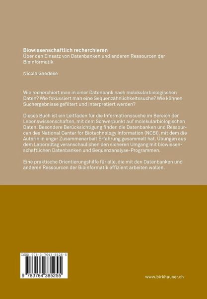 Dieses Buch ist ein Leitfaden für die Informationssuche im Bereich der Lebenswissenschaften, mit dem Schwerpunkt auf molekularbiologischen Daten. Besondere Berücksichtigung finden die Datenbanken und Ressourcen des National Center for Biotechnology Information (NCBI), mit dem die Autorin in enger Zusammenarbeit Erfahrung gesammelt hat. Übungen aus dem Laboralltag veranschaulichen den sicheren Umgang mit biowissenschaftlichen Datenbanken und Sequenzanalyse-Programmen.