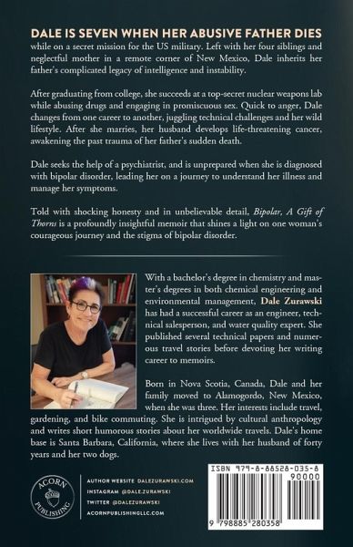 Dale is seven when her abusive father dies while on a secret mission for the US military. Left with her four siblings and neglectful mother in a remote corner of New Mexico, Dale inherits her father's complicated legacy of intelligence and instability. After graduating from college, she succeeds at a top-secret nuclear weapons lab while abusing drugs and engaging in promiscuous sex. Quick to anger, Dale changes from one career to another, juggling technical challenges and her wild lifestyle. After she marries, her husband develops life-threatening cancer, awakening the past trauma of her father's sudden death. Dale seeks the help of a psychiatrist, and is unprepared when she is diagnosed with bipolar disorder, leading her on a journey to understand her illness and manage her symptoms. Told with shocking honesty and in unbelievable detail, Bipolar, A Gift of Thorns is a profoundly insightful memoir that shines a light on one woman's courageous journey and the stigma of bipolar disorder.