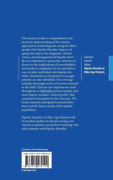 "This is a comprehensive review of current research regarding the evaluation and management of older adults suffering from bipolar disorder. ... It is intended for general psychiatrists caring for older adults with bipolar disorder. It is also relevant for all gerontologists, residents, medical students, and health care providers and policy makers involved in the creation of programs and treatment of this patient population. ... Each chapter includes clinical vignettes, learning points, and clinical pearls to illustrate the principles." (Michael Easton, Doody's Book Reviews, June, 2017)