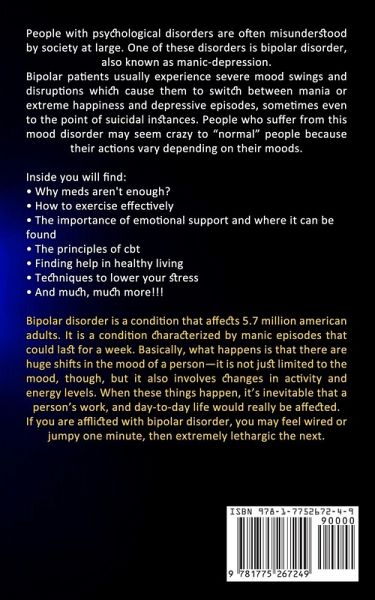 People with psychological disorders are often misunderstood by society at large. One of these disorders is bipolar disorder, also known as manic-depression. Bipolar patients usually experience severe mood swings and disruptions which cause them to switch between mania or extreme happiness and depressive episodes, sometimes even to the point of suicidal instances. People who suffer from this mood disorder may seem crazy to "normal" people because their actions vary depending on their moods. Inside you will find:Why meds aren't enough? How to exercise effectively The importance of emotional support and where it can be found The principles of cbt Finding help in healthy living Techniques to lower your stress And much, much more!!! Bipolar disorder is a condition that affects 5.7 million american adults. It is a condition characterized by manic episodes that could last for a week. Basically, what happens is that there are huge shifts in the mood of a person-it is not just limited to the mood, though, but it also involves changes in activity and energy levels. When these things happen, it's inevitable that a person's work, and day-to-day life would really be affected. If you are afflicted with bipolar disorder, you may feel wired or jumpy one minute, then extremely lethargic the next.