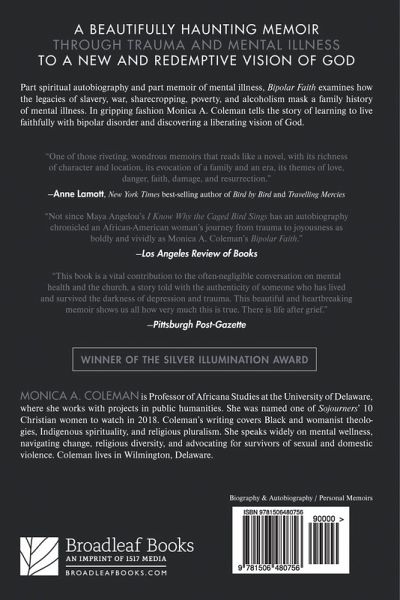 Both a spiritual autobiography and a memoir of mental illness, Biploar Faith examines how the legacies of slavery, war, sharecropping, poverty, and alcoholism mask a family history of mental illness. In gripping fashion Monica A. Coleman tells the story of learning to live faithfully with bipolar disorder and discovering a liberating vision of God.