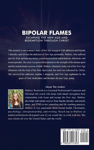 This memoir is one woman's story of how she struggled with addiction and bipolar 1 disorder and fell into the darkness of New Age spirituality. Mallory, who suffered gravely from spiritual psychosis, experienced hellish hallucinations, delusions, and mood episodes. Her story is a powerful testament to the strength of the human spirit and the transformative power of faith. Mallory ultimately broke out of her New Age delusions with the help of the Holy Spirit, and her soul was redeemed by Christ. She survived her addiction, bipolar 1 diagnosis, and New Age nightmare by the grace of God, medication, and because she just kept going.