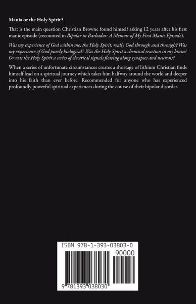 Mania or the Holy Spirit? That is the main question Christian Browne found himself asking 12 years after his first manic episode (recounted in Bipolar in Barbados: A Memoir of My First Manic Episode). Was my experience of God within me, the Holy Spirit, really God through and through? Was my experience of God purely biological? Was the Holy Spirit a chemical reaction in my brain? Or was the Holy Spirit a series of electrical signals flowing along synapses and neurons? When a series of unfortunate circumstances creates a shortage of lithium Christian finds himself lead on a spiritual journey which takes him halfway around the world and deeper into his faith than ever before. Recommended for anyone who has experienced profoundly powerful spiritual experiences during the course of their bipolar disorder.