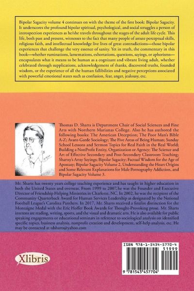 Bipolar Sagacity Volume 4 continues with the theme of the first book: Bipolar Sagacity. It underscores the profound bipolar spiritual, psychological, and social struggles a person of introspection experiences as he/she travels throughout the stages of the adult life cycle. This life, both past and present, is witness to the fact that many people of astute perceptual skills, religious faith, and intellectual knowledge live lives of great contradictions-those bipolar experiences that challenge the very essence of sanity. Yet in truth, the commentary in this book-whether ruminations, lamentations, exhortations, questions, sayings, or aphorisms-encapsulates what it means to be human as a cognizant and vibrant living adult, whether celebrated through supplications, acknowledgement of thanks, discovered truths, founded wisdom, or the experience of all the human fallibilities and negative perceptions associated with powerful emotional states such as confusion, fear, anger, jealousy, etc.