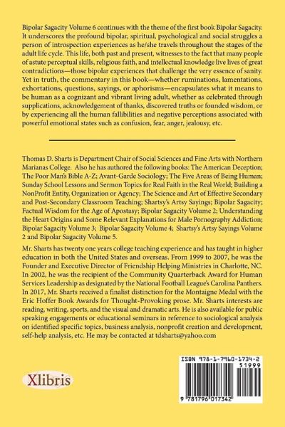 Bipolar Sagacity Volume 6 continues with the theme of the first book Bipolar Sagacity. It underscores the profound bipolar, spiritual, psychological, and social struggles a person of introspection experiences as he/she travels throughout the stages of the adult life cycle. This life, both past and present, witnesses to the fact that many people of astute perceptual skills, religious faith, and intellectual knowledge live lives of great contradictions-those bipolar experiences that challenge the very essence of sanity. Yet in truth, the commentary in this book-whether ruminations, lamentations, exhortations, questions, sayings, or aphorisms-encapsulates what it means to be human as a cognizant and vibrant living adult, whether as celebrated through supplications, acknowledgement of thanks, discovered truths or founded wisdom, or by experiencing all the human fallibilities and negative perceptions associated with powerful emotional states such as confusion, fear, anger, jealousy, etc.