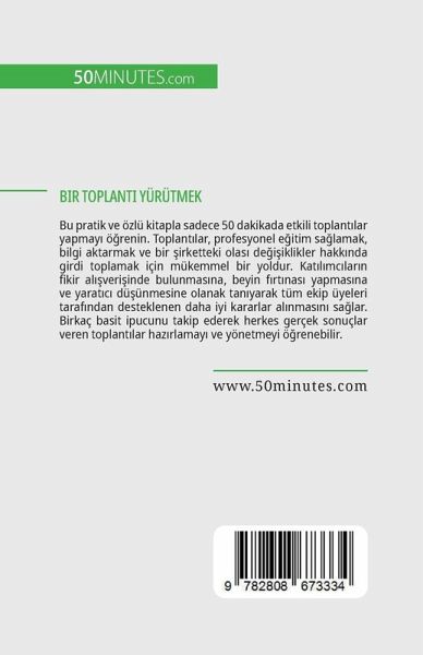 Bu pratik ve özlü kitapla sadece 50 dakikada etkili toplant¿lar yapmay¿ ö¿renin. Toplant¿lar, profesyonel e¿itim sälamak, bilgi aktarmak ve bir ¿irketteki olas¿ de¿i¿iklikler hakk¿nda girdi toplamak için mükemmel bir yoldur. Kat¿l¿mc¿lar¿n fikir al¿¿veri¿inde bulunmas¿na, beyin f¿rt¿nas¿ yapmas¿na ve yarat¿c¿ dü¿ünmesine olanak tan¿yarak tüm ekip üyeleri taraf¿ndan desteklenen daha iyi kararlar al¿nmas¿n¿ sälar. Birkaç basit ipucunu takip ederek herkes gerçek sonuçlar veren toplant¿lar haz¿rlamay¿ ve yönetmeyi ö¿renebilir. Bu kitapta, etkili toplant¿lara liderlik etmenin proje yönetimi, ileti¿im ve liderlik becerilerinizi geli¿tirmenize nas¿l yard¿mc¿ olabilece¿ini ö¿reneceksiniz. Ayr¿ca, toplant¿ gündeminizi planlamak için faydal¿ ipuçlar¿ ve karar alma sürecini iyile¿tirmek için birlikte çal¿¿abilmeniz için hedef belirleme ve insanlar¿ motive etme konusunda tavsiyeler içerir.
