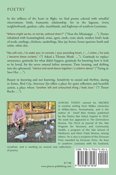 "Poems colored with mindful observations: birds, humanity, the little and big. Set in the forests, backyards, swamps, cafâes, homes, beaches of Louisiana. Burdens lifted as "dragonflies swarm and pick me up." Beauty in knowing and not knowing; stillness and flight. Respect and concern for the Earth. Sensitivity to sound and rhythm, daring in forms, Ahrend Torrey's second book of poetry, Bird City, American Eye is one to relish and explore, on and off the pages"--