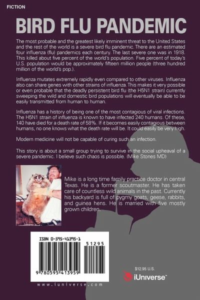 The most probable and the greatest likely imminent threat to the United States and the rest of the world is a severe bird flu pandemic. There are an estimated four influenza (flu) pandemics each century. The last severe one was in 1918. This killed about five percent of the world's population. Five percent of today's U.S. population would be approximately fifteen million people (three hundred million of the world's pop.). Influenza mutates extremely rapidly even compared to other viruses. Influenza also can share genes with other strains of influenza. This makes it very possible or even probable that the deadly persistent bird flu (the H5N1 strain) currently sweeping the wild and domestic bird populations will eventually be able to be easily transmitted from human to human. Influenza has a history of being one of the most contagious of viral infections. The H5N1 strain of influenza is known to have infected 240 humans. Of these, 140 have died for a death rate of 58%. If it becomes easily contagious between humans, no one knows what the death rate will be. It could easily be very high. Modern medicine will not be capable of curing such an infection. This story is about a small group trying to survive in the social upheaval of a severe pandemic. I believe such chaos is possible. (Mike Stones MD)