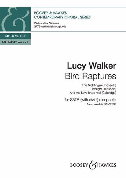 Bird Raptures, ein Set von drei Stücken, die sich stilistisch am Liedgut des 20. Jahrhunderts orientieren, wurde im Frühjahr 2025 für St Martin's Voices komponiert, speziell für das Debütalbum von Lucy Walker (Resonus, RES10361). Der Text zu The Nightingale, Christina Rossettis titelgebendes Gedicht Bird Raptures, lullt den Zuhörer mit einem beschwingten Metrum ein und beschreibt die fesselnde Kraft des Gesangs einer Nachtigall, der sowohl Trauer als auch Freude ausdrückt. Diese Vertonung ist ein erfundenes Volkslied, das mit einem wehmütigen Sopransolo beginnt, bevor es in den vollen Chorsatz der Strophe übergeht. Dieselbe Melodie wird zweimal neu harmonisiert, wobei sowohl eine kraftvolle, vom Jazz beeinflusste Chromatik als auch eine ausgedehnte harmonische Wärme zum Tragen kommen. In Twilight beschwört der Text von Sara Teasdale durch die Wiederholung der Worte 'calling, calling' ein tiefes Gefühl von Sehnsucht und Distanz herauf. Der Chor ahmt nicht den Gesang der Vögel nach, sondern verkörpert den rufenden Vogel mit einem aufsteigenden, aber melancholischen Refrain. Sich überschneidende Rhythmen suggerieren Konversation und Spannung zwischen den Stimmen, und die tragisch unschlüssige Poesie spiegelt sich in der Chortextur wider, die am Ende des Liedes unaufgelöst zu einer einzigen Stimme verklingt. Die Unschuld und ungezügelte Freude von Coleridges Answer to a child's question bietet einen unbeschwerten Abschluss dieses Satzes. Mit extravagantem Rubato und übertriebener Dynamik steigert sich das Stück zu einem theatralischen Höhepunkt, bevor es die Zuhörenden in die letzte Zeile, 'And my Love loves me!' in launigem Unisono hineinzieht. Das Set eignet sich für einen selbstbewussten Chor als vielseitiges Konzert-Stück. Die einzelnen Teile können in der Reihenfolge dieser Partitur oder einzeln aufgeführt werden.Schwierigkeitsgrad: 3-4