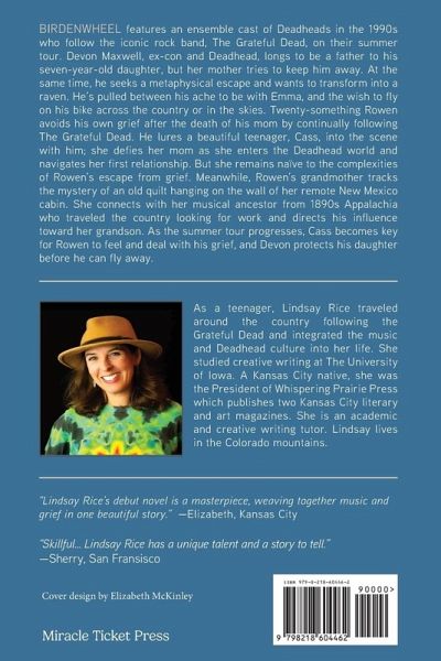 BIRDENWHEEL features an ensemble cast of Deadheads in the 1990s who follow the iconic rock band, The Grateful Dead on their summer tour. Devon Maxwell, ex-con and Deadhead, longs to be a father to his seven-year-old daughter, but her mother tries to keep him away. At the same time, he seeks a metaphysical escape and wants to transform into a raven. He's pulled between his ache to be with Emma, and the wish to fly on his bike across the country or in the skies. Twenty-something Rowen avoids his own grief after the death of his mom by continually following The Grateful Dead. He lures a beautiful teenager, Cass, into the scene with him; she defies her mom as she enters the Deadhead world and navigates her first relationship. But she remains naïve to the complexities of Rowen's escape from grief. Meanwhile, Rowen's grandmother tracks the mystery of an old quilt hanging on the wall of her remote New Mexico cabin. She connects with her musical ancestor from 1890s Appalachia who traveled the country looking for work and directs his influence toward her grandson. As the summer tour progresses, Cass becomes key for Rowen to feel and deal with his grief, and Devon protects his daughter before he can fly away. Stories that seem unrelated in the beginning turn out to be connected in surprising ways as the book reaches its climax. The ties between these characters are just as deep and mystical as the bonds between the dancing strangers in the thrall of great music.