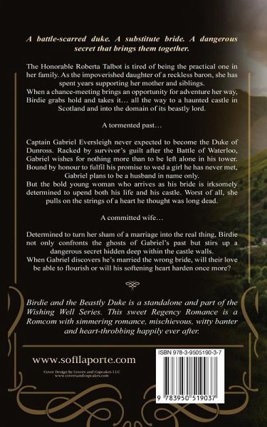 A battle-scarred duke. A substitute bride. A dangerous secret that brings them together. The Honorable Roberta Talbot is tired of being the practical one in her family. As the impoverished daughter of a reckless baron, she has spent years supporting her mother and siblings. When a chance meeting brings an opportunity for adventure her way, Birdie grabs hold and takes it... all the way to a haunted castle in Scotland and into the domain of its beastly lord. A tormented past... Captain Gabriel Eversleigh never expected to become the Duke of Dunross. Racked by survivor's guilt after the Battle of Waterloo, Gabriel wishes for nothing more than to be left alone in his tower. Bound by honour to fulfil his promise to wed a girl he has never met, Gabriel plans to be a husband in name only. But the bold young woman who arrives as his bride is irksomely determined to upend both his life and his castle. Worst of all, she pulls on the strings of a heart he thought was long since dead. A committed wife... Determined to turn her sham marriage into the real thing, Birdie not only confronts the ghosts of Gabriel's past but stirs up a dangerous secret hidden deep within the castle walls. But when Gabriel discovers he's married the wrong bride, will their love be able to flourish, or will his softening heart harden once more? ¿¿¿ This Beauty and the Beast variation is a sweet Regency romance that is part of the Wishing Well series; however, it can be read as a separate story. Trigger Warning: Even though there are no graphic descriptions of violence in this book, topics of war, PTSD, and suicide play a role in the main characters' pasts.
