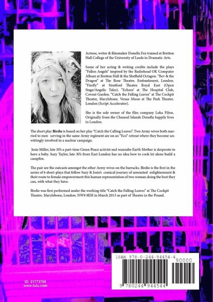 Birdie is based on Donella's play "Catch the Calling Leaves", two army wives both married to men serving in the same regiment are on an "Eco" retreat where they become unwittingly involved in a nuclear campaign. Josie Miller, late 30's a part-time GreenPeace activist and wannabe Earth Mother is desperate to have a baby. Suzy Taylor, late 30's from East London has no idea how to cook let alone build a camp fire. They are the outcasts amongst the other army wives on the barracks. This is the first in the series of 6 short-plays that follow Suzy & Josie's comical journey of unwanted enlightenment & their route to female empowerment. Two woman, bestfriend's doing the best they can, with what they have.