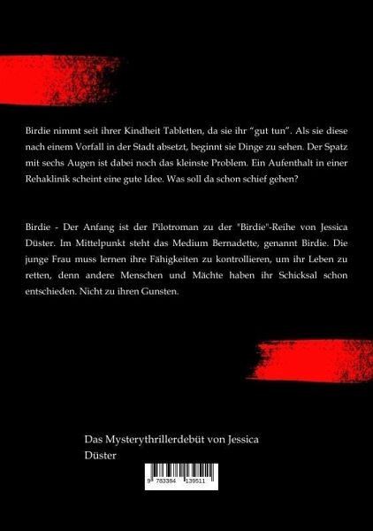 Birdie nimmt seit ihrer Kindheit Tabletten, da sie ihr "gut tun". Als sie diese nach einem Vorfall in der Stadt absetzt, beginnt sie Dinge zu sehen. Der Spatz mit sechs Augen ist dabei noch das kleinste Problem. Ein Aufenthalt in einer Rehaklinik scheint eine gute Idee. Was soll da schon schief gehen?Birdie - Der Anfang ist der Pilotroman zu der "Birdie"-Reihe von Jessica Düster. Im Mittelpunkt steht das Medium Bernadette, genannt Birdie. Die junge Frau muss lernen ihre Fähigkeiten zu kontrollieren, um ihr Leben zu retten, denn andere Menschen und Mächte haben ihr Schicksal schon entschieden. Nicht zu ihren Gunsten.
