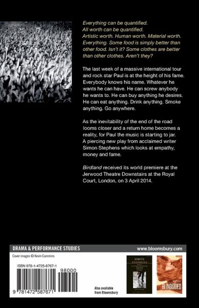 Everything can be quantified. All worth can be quantified. Artistic worth. Human worth. Material worth. Everything. Some food is simply better than other food. Isn't it? Some clothes are better than other clothes. Aren't they? The last week of a massive international tour and rock star Paul is at the height of his fame. Everybody knows his name. Whatever he wants he can have. He can screw anybody he wants to. He can buy anything he desires. He can eat anything. Drink anything. Smoke anything. Go anywhere. As the inevitability of the end of the road looms closer and a return home becomes a reality, for Paul the music is starting to jar. Birdland received its world premiere at the Royal Court Theatre Downstairs on 3 April 2014.