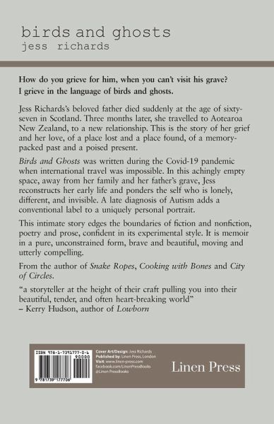 Jess Richards's beloved father died suddenly at the age of sixty-seven in Scotland. Three months later, she travelled to Aotearoa New Zealand, to a new relationship. This is the story of her grief and her love, of a place lost and a place found, of a memory-packed past and a poised present. Birds and Ghosts was written during the Covid-19 pandemic when international travel was impossible. In this achingly empty space, away from her family and her father's grave, Jess reconstructs her early life and ponders the self who is lonely, different, and invisible. A late diagnosis of Autism adds a conventional label to a uniquely personal portrait. This intimate story edges the boundaries of fiction and nonfiction, poetry and prose, confident in its experimental style. It is memoir in a pure, unconstrained form, brave and beautiful, moving and utterly compelling. From the author of Snake Ropes, Cooking