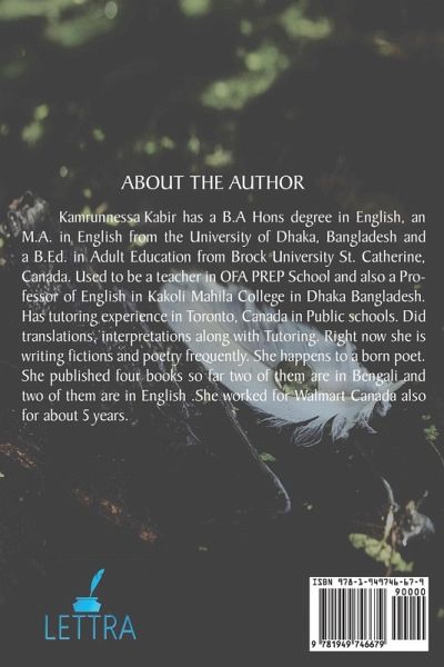 Kamrunnessa Kabir has a B.A Hons degree in English, an M.A. in English from the University of Dhaka, Bangladesh and a B.Ed. in Adult Education from Brock University St. Catherine, Canada. Used to be a teacher in OFA PREP School and also a Professor of English in Kakoli Mahila College in Dhaka Bangladesh. Has tutoring experience in Toronto, Canada in Public schools. Did translations, interpretations along with Tutoring. Right now she is writing fictions and poetry frequently. She happens to a born poet. She published four books so far two of them are in Bengali and two of them are in English. She worked for Walmart Canada also for about 5 years.