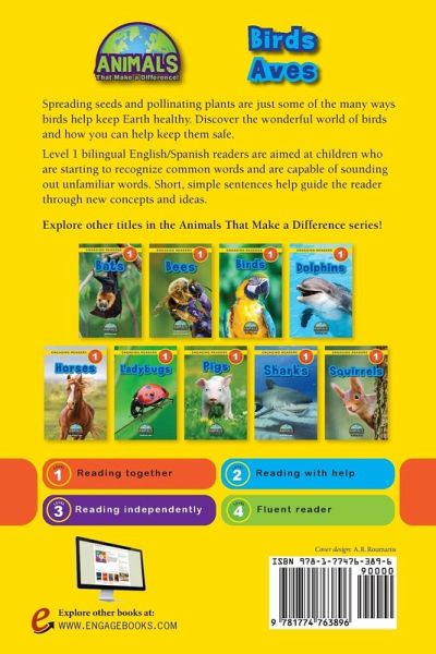 Bilingual English/Spanish Level 1 Reader for Kids! Spreading seeds and pollinating plants are just some of the many ways birds help keep Earth healthy. Discover the wonderful world of birds and how you can help keep them safe. Level 1 bilingual English/Spanish (Inglés/Español) readers are aimed at children who are starting to recognize common words and are capable of sounding out unfamiliar words. Short, simple sentences help guide the reader through new concepts and ideas. Check out other books in the series!Bats / Murciélagos Bees / Abejas Birds / Aves Dolphins / Delfines Horses / Caballos Ladybugs / Catarinas Pigs / Cerdos Sharks / Tiburones Squirrels / Ardillas