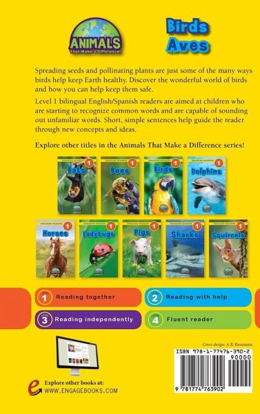 Bilingual English/Spanish Level 1 Reader for Kids! Spreading seeds and pollinating plants are just some of the many ways birds help keep Earth healthy. Discover the wonderful world of birds and how you can help keep them safe. Level 1 bilingual English/Readers (Inglés/Español) readers are aimed at children who are starting to recognize common words and are capable of sounding out unfamiliar words. Short, simple sentences help guide the reader through new concepts and ideas. Check out other books in the series!Bats / Murciélagos Bees / Abejas Birds / Aves Dolphins / Delfines Horses / Caballos Ladybugs / Catarinas Pigs / Cerdos Sharks / Tiburones Squirrels / Ardillas