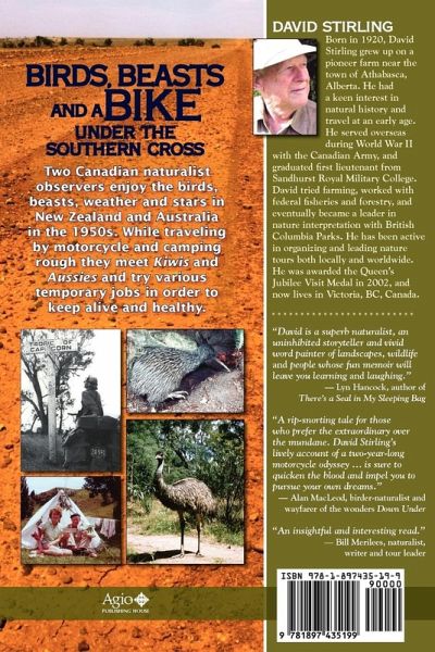 Birds, Beasts and a Bike Under the Southern Cross: Two Canadian Naturalists Camping Rough in New Zealand and Australia in the 1950s by David Stirling. This is the story of two Canadian naturalist observers enjoying the birds, beasts, weather and stars in New Zealand and Australia in the 1950s. While traveling by motorcycle and camping rough, they meet Kiwis and Aussies and try various temporary jobs in order to keep alive and healthy. About the author, David Stirling Born in 1920, David Stirling grew up on a pioneer farm near the town of Athabasca, Alberta. He had a keen interest in natural history and travel at an early age. He served overseas during World War II with the Canadian Army, and graduated first lieutenant from Sandhurst Royal Military College. David tried farming, worked with federal fisheries and forestry, and eventually became a leader in nature interpretation with British Columbia Parks. He has been active in organizing and leading nature tours both locally and worldwide. He was awarded the Queen's Jubilee Visit Medal in 2002, and now lives in Victoria, BC, Canada. Review comments "David is a superb naturalist, an uninhibited storyteller and vivid word painter of landscapes, wildlife and people whose fun memoir will leave you learning and laughing." -- Lyn Hancock, well-known author of many popular books, including Looking for the Wild, Tabasco the Saucy Raccoon and There's a Seal in My Sleeping Bag "A rip-snorting tale for those who prefer the extraordinary over the mundane. David Stirling's lively account of a two-year-long motorcycle odyssey among the wonders of Australia and New Zealand is sure to quicken the blood and impel you to pursue your own dreams." -- Alan MacLeod, birder-naturalist and sometime wayfarer among the wonders Down Under "An insightful and interesting read about travel and nature in the lands Down Under post World War II." -- Bill Merilees, naturalist, writer and tour leader