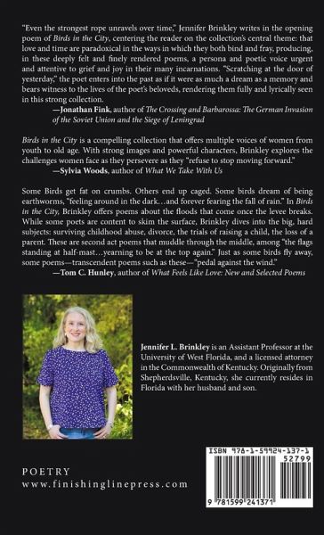 Birds in the City offers reflections on love and loss. Written from different points of view, the collection examines divorce, abuse, loss of loved ones, and the challenges of parenting. The poems explore the tension between reality and dreams, of history and the future. They are deeply felt poems, allowing the reader to visit the lives of others, vicariously experiencing their moments, big and small.
