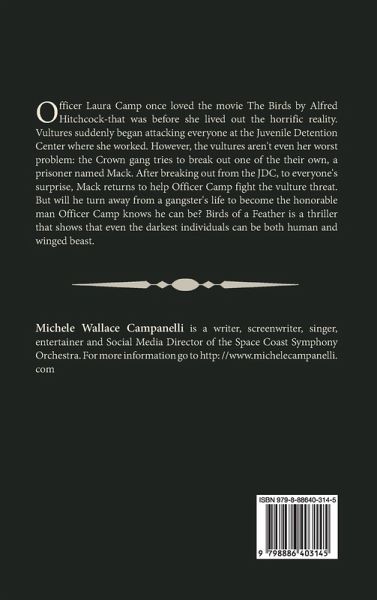 Officer Laura Camp once loved the movie The Birds by Alfred Hitchcock-that was before she lived out the horrific reality. Vultures suddenly began attacking everyone at the Juvenile Detention Center where she worked. However, the vultures aren't even her worst problem: the Crown gang tries to break out one of the their own, a prisoner named Mack. After breaking out from the JDC, to everyone's surprise, Mack returns to help Officer Camp fight the vulture threat. But will he turn away from a gangster's life to become the honorable man Officer Camp knows he can be? Birds of a Feather is a thriller that shows that even the darkest individuals can be both human and winged beast.