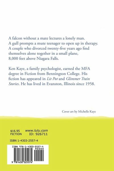 A falcon without a mate lectures a lonely man. A gull prompts a mute teenager to open up in therapy. A couple who divorced twenty-five years ago find themselves alone together in a small plane, 8,000 feet above Niagara Falls. Ken Kaye, a family psychologist, earned the MFA degree in Fiction from Bennington College. His fiction has appeared in Lit Pot and Glimmer Train Stories. He has lived in Evanston, Illinois since 1958.