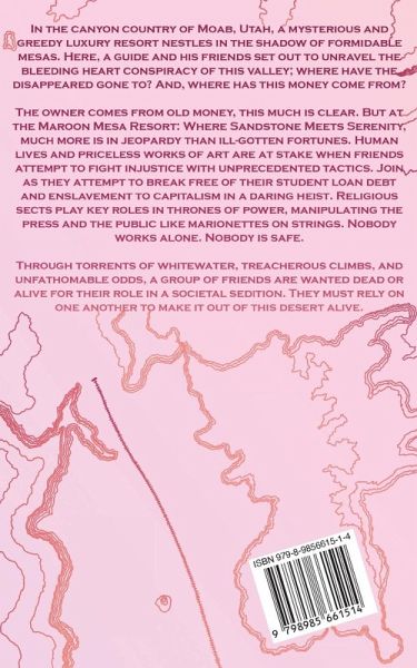 In the canyon country of Moab, Utah, a mysterious and greedy luxury resort nestles in the shadow of formidable mesas. Here, a guide and his friends set out to unravel the bleeding heart conspiracy of this valley; where have the disappeared gone to? And, where has this money come from? The owner comes from old money, this much is clear. But at the Maroon Mesa Resort: Where Sandstone Meets Serenity, much more is in jeopardy than ill-gotten fortunes. Human lives and priceless works of art are at stake when friends attempt to fight injustice with unprecedented tactics. Join as they attempt to break free of their student loan debt and enslavement to capitalism in a daring heist. Religious sects play key roles in thrones of power, manipulating the press and the public like marionettes on strings. Nobody works alone. Nobody is safe. Through torrents of whitewater, treacherous climbs, and unfathomable odds, a group of friends are wanted dead or alive for their role in a societal sedition. They must rely on one another to make it out of this desert alive.
