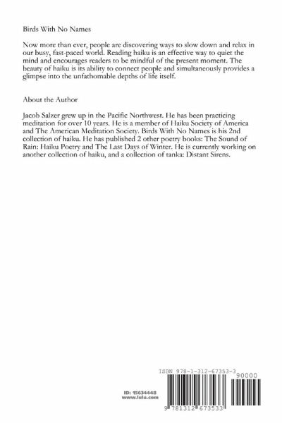 Birds with No Names is a collection of haiku by Jacob Salzer. Salzer's haiku encourages the reader to quiet the mind and be mindful of the present moment.