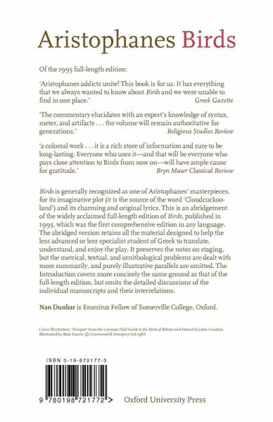 Of the 1995 full-length edition: `Aristophanes addicts unite! This book is for us. It has everything that we always wanted to know about Birds and we were unable to find in one place.' Greek Gazette `The commentary elucidates with an experts knowledge of syntax, meter, and artifacts.... The volume will remain authoritative for generations.' Religious Studies Review Birds is generally recognized as one of Aristophanes' masterpieces, for its imaginative plot (it is the source of the word `Cloudcuckooland'), and its charming and original lyrics. This is an abridgement of Nan Dunbar's widely acclaimed edition of Birds published in 1995, which was the first comprehensive edition in any language. The abridged version retains all the material designed to help the less advanced student of Greek or the non-specialist to translate, understand, and enjoy the play. It retains the notes on staging, but the metrical, textual, and ornithological problems are dealt with more summarily, and purely illustrative parallels are omitted. The Introduction covers more concisely the same ground as that of the full-length edition, but omits the detailed discussions of the individual manuscripts and their interrelations.