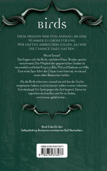 Diese Mission war von Anfang an eine Nummer zu groß für uns. Wir hätten abbrechen sollen, als wir die Chance dazu hatten.Wo ist Simon? Das fragen sich die Birds, nachdem Klaus` Bruder spurlos verschwand. Das Mitglied der gegnerischen Snakes ist verzweifelt und bittet King Lui, Bibi, Phil und Stefanie um Hilfe. Eine erste Spur führt die Clique in ein Internat, wo sie auf einen alten Bekannten treffen.Als die Birds erkennen, worauf sie sich bei der Suche eingelassen haben, sind sie bereits mitten in einer riskanten Schnitzeljagd. Ein Spiel gegen die Zeit beginnt. Simon ist irgendwo da draußen und ihn zu finden, wird immer gefährlicher.Band 2 des für den Selfpublishing-Buchpreis nominierten BoD Bestsellers.