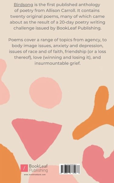 Birdsong is the first published anthology of poetry from Allison Carroll. It contains 20 original poems, some of which were first written a few years ago, and the rest on a sunny day on her backyard patio. Many came about as the result of a writing prompt in the form of a 20day poetry writing challenge issued by Alvira Publishing House, a sister company of BookLeaf. Poems cover a range of topics from agency, to body image issues, anxiety and depression, issues of race and of faith, of friendship (or a loss thereof), love (winning and losing it), and insurmountable grief. It is the author's hope that readers will find something of themselves within these poems to bring them comfort.