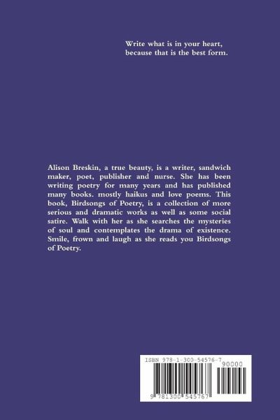 Alison Breskin, a true beauty, is a writer, sandwich maker, poet, publisher and nurse. She has been writing poetry for many years and has published many poetry books, mostly haikus and love poems. This book, Birdsongs of Poetry, is a collection of more serious and dramatic works as well as some social satire as well. Walk with her as she searches the mysteries of soul and contemplates the drama of existence. Smile, frown and laugh as she reads you Birdsongs of Poetry.