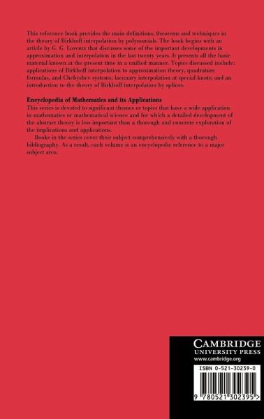 This reference book provides the main definitions, theorems and techniques in the theory of Birkhoff interpolation by polynomials. The book begins with an article by G. G. Lorentz that discusses some of the important developments in approximation and interpolation in the last twenty years. It presents all the basic material known at the present time in a unified manner. Topics discussed include: applications of Birkhoff interpolation to approximation theory, quadrature formulas, and Chebyshev systems; lacunary interpolation at special knots; and an introduction to the theory of Birkhoff interpolation by splines.