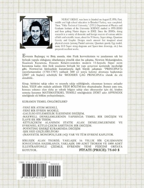 Evrenin Baslangic ve Bitis aninda, tum Fizik kuvvetlerinin & yasalarinin tek bir birlesik yapida oldugunu isbatlamaya yonelik, 16 YILLIK bir emegin sonucu olan cal¿sma, Newton Mekaniginden, Kuantum Kuramina, Einstein Relativitesinden Modern 11-boyutlu Super sicim kuramina kadar, tum fizik yasalarini birlesik bir yapi cercevesi icerisinde inceledigi gibi, Newton'un kutlecekim kuramlariyla ilgili buyuk calismasi "PRINCIPIA"yi yayinlamasindan (1703-1707) yaklasik 300 yil sonra kaleme alinmaya baslanmasi (2007 basi) ile; bir 'MODERN CAG PRINCIPIA'si olarak ele alinabilir.. Kitap, birbirini takip eden ve sirayla takip edildiginde, okunmasi konuyu anlasilir kilan, YEDI makale seklinde YEDI BOLUM'den olusmaktadir. Bunun yaninda,konuya yabanci olan daha az teknik bilgiye sahip olan okuyucular icin de, kitabin sonuna kuramin MATEMATIKSEL TEMELI niteliginde DORT APPENDIX niteliginde EK BOLUM yerlestirilmistir. KURAMIN TEMEL ONGORULERI? -YENI BIR ATOM MODELI -YENI BIR EVREN MODELI -GALILEO ILKESINDE DEGISIM