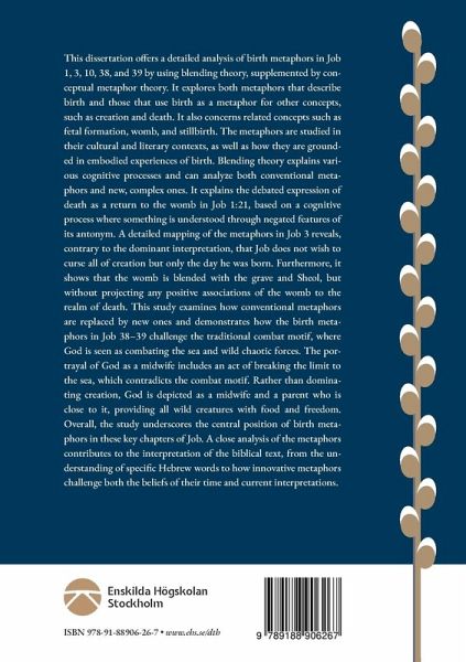 This dissertation o!ers a detailed analysis of birth metaphors in Job 1, 3, 10, 38, and 39 by using blending theory, supplemented by conceptual metaphor theory. It explores both metaphors that describe birth and those that use birth as a metaphor for other concepts, such as creation and death. It also concerns related concepts such as fetal formation, womb, and stillbirth. The metaphors are studied in their cultural and literary contexts, as well as how they are grounded in embodied experiences of birth. Blending theory explains various cognitive processes and can analyze both conventional metaphors and new, complex ones. It explains the debated expression of death as a return to the womb in Job 1:21, based on a cognitive process where something is understood through negated features of its antonym. A detailed mapping of the metaphors in Job 3 reveals, contrary to the dominant interpretation, that Job does not wish to curse all of creation but only the day he was born. Furthermore, it shows that the womb is blended with the grave and Sheol, but without projecting any positive associations of the womb to the realm of death. This study examines how conventional metaphors are replaced by new ones and demonstrates how the birth metaphors in Job 38-39 challenge the traditional combat motif, where God is seen as combating the sea and wild chaotic forces. The portrayal of God as a midwife includes an act of breaking the limit to the sea, which contradicts the combat motif. Rather than dominating creation, God is depicted as a midwife and a parent who is close to it, providing all wild creatures with food and freedom. Overall, the study underscores the central position of birth metaphors in these key chapters of Job. A close analysis of the metaphors contributes to the interpretation of the biblical text, from the understanding of specific Hebrew words to how innovative metaphors challenge both the beliefs of their time and current interpretations.