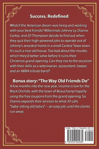 They wanted to save the world. Now they'd be happy to cover rent and student loans. Johnny Ly wanted to rescue and heal all the cats. Dianne Cortez thought that if numbers couldn't save the world, she could at least save people's money. JD Thompson wanted to bring justice to people caught in the legal system, but he can't do it for free. Also, they like to sing. Somehow, the American Dream isn't working out for them. When Johnny's grandmother offers them her old mansion, they flee high-powered jobs in Austin, TX, for a fresh start in the small Texas town of Beauchamp. It's a nice old house. Too bad about the murder, which they'd better solve before it ruins their Christmas grand opening. Can they rise to the occasion as detectives with their skills as a veterinarian, accountant, lawyer, and ABBA tribute band? Bonus story: "The Way Old Friends Do" A few months later, Johnny regrets becoming Assistant Animal Control Officer when he breaks his leg during an encounter with a wild hog. Dianne regrets all the free coupons they handed out at the open house. JD regrets her idea of expanding their services into "babysitting old ladies." Monitoring the finances of their elderly neighbor, Miss Leigh, seems like easy money, until the client runs away. Once again, they have to become detectives as they set out in a wild chase across the country to find Miss Leigh. Will they be in time to save her from herself, save the country from her, and save her dying friend?
