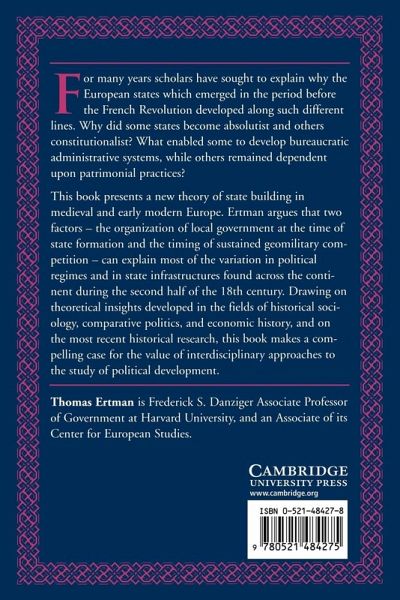 This book presents a new theory of state building in medieval and early modern Europe. Ertman argues that two factors--the organization of local government at the time of state formation and the timing of sustained geomilitary competition--can explain most of the variation in political regimes and in state infrastructures found across the continent during the second half of the 18th century.