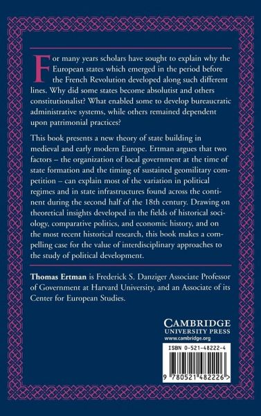 For many years scholars have sought to explain why the European states which emerged in the period before the French Revolution developed along such different lines. Why did some become absolutist and others constitutionalist? What enabled some to develop bureaucratic administrative systems, while others remained dependent upon patrimonial practices? This book presents a new theory of state-building in medieval and early modern Europe. Ertman argues that two factors - the organisation of local government at the time of state formation and the timing of sustained geo-military competition - can explain most of the variation in political regimes and in state infrastructures found across the continent during the second half of the eighteenth century. Drawing on insights developed in historical sociology, comparative politics, and economic history, this book makes a compelling case for the value of interdisciplinary approaches to the study of political development.