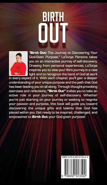 Are you ready to give birth to the purpose God placed within you? "Birth Out" by LaTonya Parsons isn't just a book, it's a divine invitation. With raw honesty and spiritual depth, LaTonya takes you by the hand and walks you through a powerful journey of rediscovery, healing, and awakening. Blending soul-stirring storytelling with thought-provoking self-reflection exercises, she shares the lessons and revelations birthed from her own life's journey, wrapped in God's love, timing, and grace. This is more than a guide, it's a spiritual catalyst designed to ignite the fire inside you. You'll feel seen, stirred, and empowered to move forward boldly into the destiny God uniquely designed for you. "Birth Out" is your call to rise. To believe again. To push through. And to birth the purpose within you, for such a time as this.