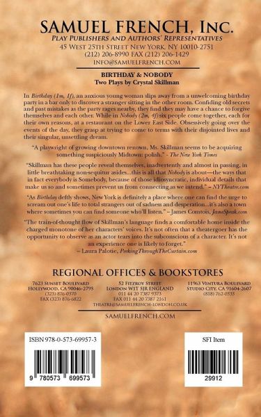 Birthday Characters: 1 male, 1 female Simple Set In Birthday, an anxious young woman slips away from a unwelcoming birthday party in a bar only to discover a stranger sitting in the other room. Confiding old secrets and past mistakes as the party rages nearby, they find they may have a chance to forgive themselves and each other. Nobody Characters: 2 male, 4 female Simple Set In Nobody six people come together, each for their own reasons, a