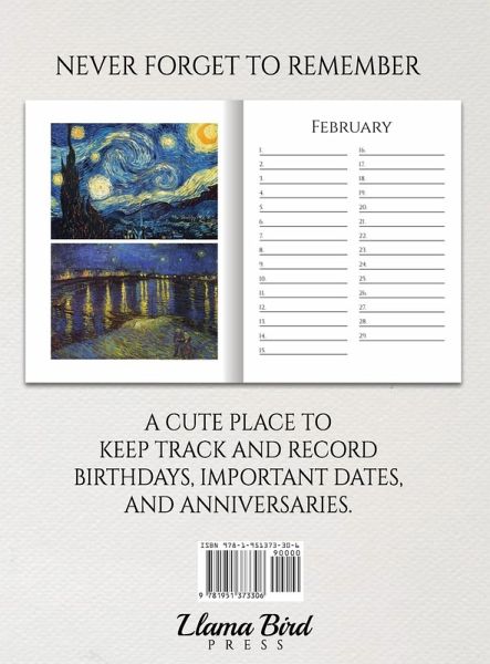 Van Gogh Paintings 12-Month perpetual birthday calendar book for birthdays, anniversaries, and important dates. Our perpetual birthday calendars measure 8.5x11 in size featuring one page for each month. Use it to track birthdays, anniversaries, special days and holidays. Hardbound book is perfect for home or office as a planner, desk calendar, diary, date keeper, or appointment calendar. Makes a unique Christmas, birthday, New Years, or graduation gift for family and friends.
