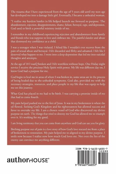The trauma that I have experienced from the age of 5 years old until my teen age has developed me into a damage little girl. Eventually, I became a unhealed woman. "I realize my hardest battles in life helped launch me forward to purpose. The abandonment, rejection, disappointments, shame, failure, betrayal, rape, and depression. God used to birth a powerful ministry inside of me. I remember in my childhood experiencing rejection and abandonment from family and friends who was suppose to love and embrace me. The painful slander and abuse that destroyed my confidence as a child. I was a teenager when I was violated. I felted like I wouldn't ever recover from the pain of sexual abuse and betrayal. I felt discarded and filthy and ashamed. I felt like I deserved what happen to me. I went into a deep depression that led me into suicidal thoughts and attempts. At the age of 18 I was broken and I felt worthless without hope. One Friday night service I receive the precious Holy Spirit with power. My life was different day on, I knew God had a purpose for me. God begin to heal me in areas of where I was broken in, some areas are in the process of being healed due to the unhealed symptoms. God also, provided me with the necessary strategies, resources, and place people in my life that was equip to help me on this journey. What God has placed in me had to be birth. I was carrying a promise inside of me that had to come fourth. My pain helped pushed me to the feet of Jesus. It was in my brokenness is where the oil flowed. Seeking God's Kingdom and his righteousness has allowed success and favor to overtake my life. I am a chosen vessel of God who discovered my divine purpose on earth. The things that tried to destroy me God has allowed me to triumph over it. It's working for my good. I am living testimony that you can come from anywhere and God can use you for glory. Birthing purpose out of pain is a love story of how God's love rescued me from a place of brokenness to restoration. My pain helped me to aligned to my divine purpose. I smile now because I realize now how much God loves me. Not even the lies of the enemy can convince me anything different.