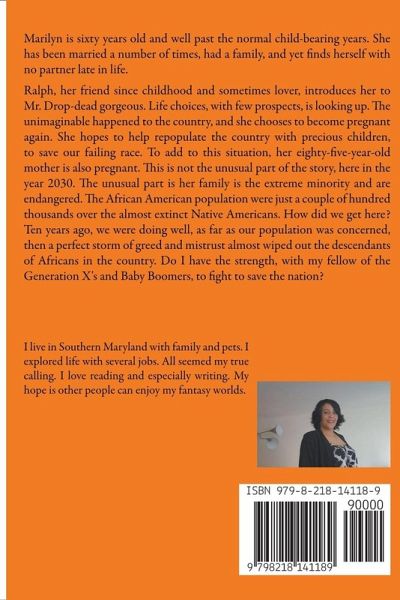 Marilyn is sixty years old and well past the normal child-bearing years. She has been married a number of times, had a family, and yet finds herself with no partner late in life. Ralph, her friend since childhood, introduces her to Mr. Drop-dead gorgeous. Life choices, with few prospects, are looking up. The unimaginable happened to the country, and she chooses to become pregnant again. She hopes to help repopulate the country with precious children, to save our failing race. Definitely not some mega healthy, perfect body workout nut-significantly overweight, with both asthma and diabetes, yet six months pregnant with African American children. To add to this situation, her eighty-five-year-old mother is also pregnant. This is not the unusual part of the story, here in the year 2030. The unusual part is her family is the extreme minority and are endangered. The African American population was just a couple of hundred thousands over the almost extinct Native Americans. How did we get here? Ten years ago, we were doing well. As far as our population was concerned, a perfect storm of greed and mistrust almost wiped out the descendants of Africans in the country. Do I have the strength, with my fellow of the Generation X's and Baby Boomers, to fight to save the nation, and who is out to stop us?