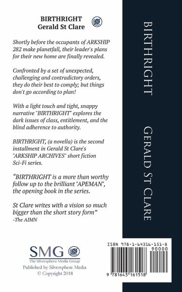 Shortly before the occupants of ARKSHIP 282 make planet fall, their leader's rules for their new home planet are finally revealed. Confronted by a set of unexpected, challenging and contradictory orders, they do their best to comply...but things don't go according to plan! With a light touch and tight, snappy narrative "BIRTHRIGHT" explores the dark issues of class, entitlement, and the blind adhearance to authority. BIRTHRIGHT, (a novella) is the second installment in Gerard St Clare's "ARKSHIP ARCHIVES" short fiction Sci Fi series. "BIRTHRIGHT is a more than worthy follow up to the brilliant "APEMAN", the opening book in the series. St Clare writes with a vision so much bigger than the short story form" -The AIMN