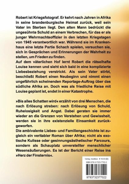 Robert ist Kriegsfotograf. Er kehrt nach Jahren in Afrika in seine brandenburgische Heimat zurück, weil sein Vater im Sterben liegt. Den alten Mann bedrückt die ungesühnte Schuld an einem Verbrechen, für das er als junger Wehrmachtsoffizier in den letzten Kriegstagen von 1945 verantwortlich war. Während sie im Krankenhaus eine letzte Partie Schach spielen, versuchen sie, sich in Gesprächen und Erinnerungen der Wahrheit zu stellen, um Frieden zu finden. Auf dem väterlichen Hof lernt Robert die rätselhafte Louise kennen und sieht sich bald in eine komplizierte Liebesbeziehung verstrickt. Als sein Vater stirbt, beschließt Robert einen Neubeginn und nimmt einen ungefährlich scheinenden Reportage-Auftrag über das südliche Afrika an. Doch was als friedliche Reise mit Louise geplant ist, endet in einer Katastrophe. +++ "Bis alles Schatten wird" erzählt von drei Menschen, die nach Erlösung streben: nach Erlösung von Schuld, Ruhelosigkeit und Angst. Dabei geraten sie immer wieder an die Grenzen von Verstehen und Gewissheit, werden sie in ihre existenzielle Einsamkeit zurückgeworfen. Die ambivalente Liebes- und Familiengeschichte ist zugleich ein veritabler Roman über Afrika; nicht als exotische Kulisse oder gesinnungsästhetischer Parcours, sondern als Schauplatz unverstellter menschlicher Wesensäußerungen. Es ist der Bericht einer Reise ins "Herz der Finsternis".
