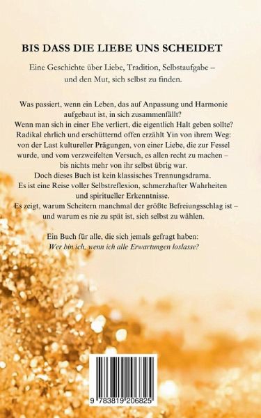 "Bis dass die Liebe uns scheidet" erzählt die Geschichte einer Frau, die sich in ihrer Ehe und den Erwartungen anderer verliert - und schließlich den Mut findet, ihre eigene Wahrheit zu wählen. Das Buch beleuchtet die Auswirkungen kultureller Prägungen, emotionale Abhängigkeiten und den tiefen Wunsch nach Selbstbestimmung. Durch eine Mischung aus persönlicher Reflexion, radikaler Ehrlichkeit und spirituellen Erkenntnissen zeigt es, wie Trennung nicht nur ein Ende, sondern auch ein Neuanfang sein kann. Wenn du dich in deiner eigenen Beziehung nicht mehr wiedererkennst - dann lies dieses Buch. Es wird unbequem. Aber es könnte dich verändern.…mehr