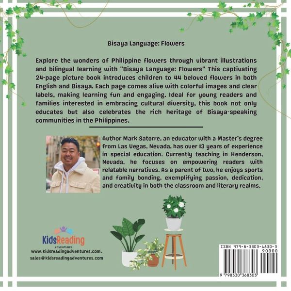Discover the beauty of Philippine flowers with "Bisaya Language: Flowers," a captivating 24-page picture book that blends vibrant illustrations with bilingual learning. This charming book introduces young readers to 44 beloved flowers, each presented in both English and Bisaya, making it a unique educational experience. As children turn each page, they will be delighted by the colorful, detailed illustrations that bring each flower to life. Clear, informative labels in both languages make the learning process engaging and enjoyable. The book is thoughtfully designed to foster a love for nature…mehr