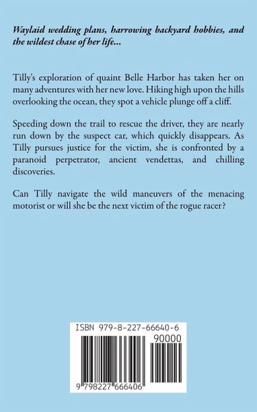 Waylaid wedding plans, harrowing backyard hobbies, and the wildest chase of her life... Tilly's exploration of quaint Belle Harbor has taken her on many adventures with her new love. Hiking high upon the hills overlooking the ocean, they spot a vehicle plunge off a cliff. Speeding down the trail to rescue the driver, they are nearly run down by the suspect car, which quickly disappears. As Tilly pursues justice for the victim, she is confronted by a paranoid perpetrator, ancient vendettas, and chilling discoveries. Can Tilly navigate the wild maneuvers of the menacing motorist or will she be the next victim of the rogue racer?