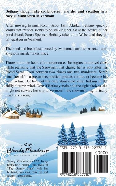 Bethany thought she could outrun murder and vacation in a cozy autumn town in Vermont. After moving to small-town Snow Falls Alaska, Bethany quickly learns that murder seems to be stalking her. So at the advice of her good friend, Sarah Spencer, Bethany takes Julie Walsh and they go on vacation in Vermont. Their bed and breakfast, owned by two comedians, is perfect… until a vicious murder takes place. Thrown into the heart of a murder case, she begins to unravel clues while realizing that the Snowman that chased her is now after her friend Sarah. Torn between two places and two murderers, Sarah finds herself in a precarious position; protect a killer, or become his next victim. But he's not the only stone-cold killer lurking in the chilly autumn wind. Even if Bethany makes all the right choices, she might not survive her trip to Vermont—the snowman might finally exact his revenge.